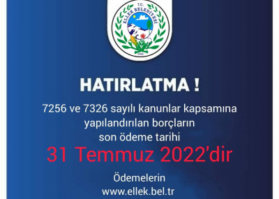 7256 ve 7326 sayılı kanunlar kapsamında yapılandırılan borçların son ödeme tarihi 31 Temmuz 2022'dir.